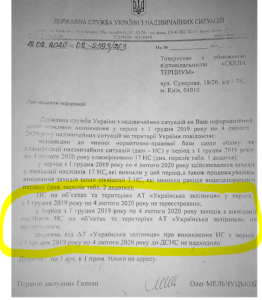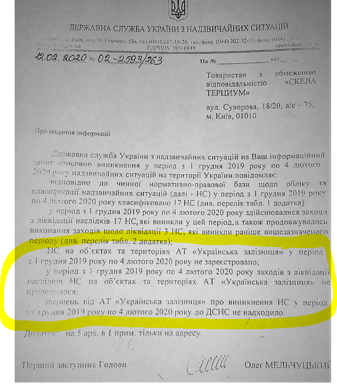 Постачальник «Скела терціум» отримав у ДСНС підтвердження того, що взимку 2019-2020 жодної надзвичайної ситуації в «Укрзалізниці» не було. А відтак не було жодної потреби ліквідовувати її наслідки. А відтак не було законної підстави проводити переговорну процедуру для «ліквідації наслідків надзвичайної ситуації».