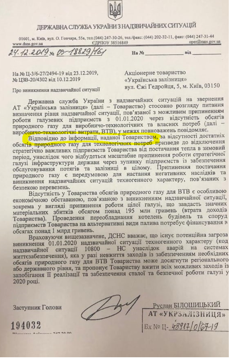 Це лист від Державної служби надзвичайних ситуацій від 24 грудня 2019 року у відповідь на запит самої «Укрзалізниці» щодо можливого виникнення надзвичайної ситуації у випадку перебоїв с постачанням газу. Його опуліковано у відповідь на сьогоднішню публікацію “Наших грошей” «ДСНС викрила «Укрзалізницю» в брехні при закупівлі газу «для ліквідації наслідків надзвичайної ситуації».
