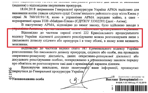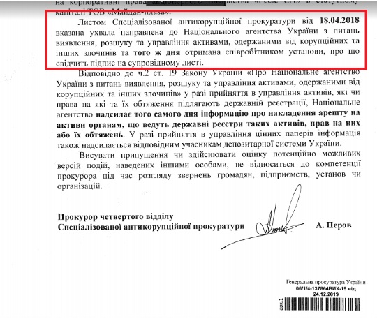 26 квітня 2018 року ухвала про заборону реєстраційних дій щодо ТОВ «Майдан-плаза» офіційно з’явилася у судовому реєстрі, утім, про неї ніхто не знав, крім прокурора, АРМА, судді та, можливо, власників компанії, які зараз стверджують, що про існування цієї ухвали не знали, а АРМА їх про неї не повідомляло.