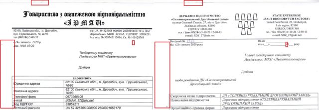 Єдиним конкурентом «Ірман» на торгах було Державне підприємство «Солевиварювальний Дрогобицький завод». Обидва учасники подали документи з однаковими плямами, що свідчить про підготовку довідок на спільній техніці.