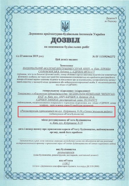 У жовтні 2019 року Національна академія внутрішніх справ як замовник та ТОВ «БК «Інтергал-Буд» як генпідрядник отримали дозвіл на реконструкцію гуртожитківна вул. Кудряшова, 8-10. Однак, насправді там будують житловий комплекс.