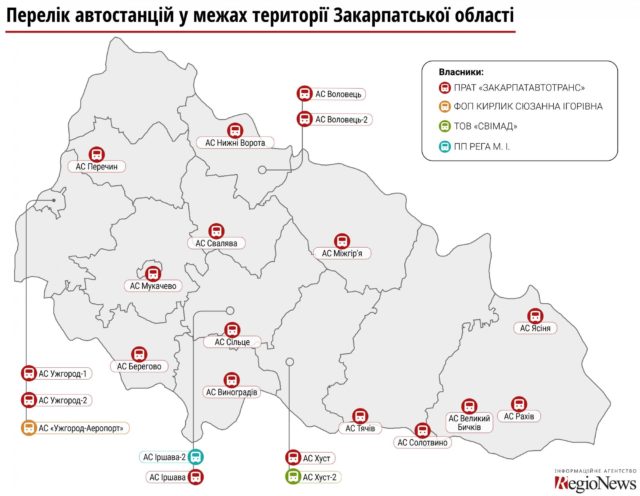 Одну автостанцію у місті Хуст має у власності ТОВ «Свімад», власниками якого є депутат Ізянської сільської ради Хустського району Володимир Мадяр та дружина екс-депутата Закарпатської обласної ради та екс-голови Берегівської РДА Ігоря Свищо – Наталія Вищо. А розташований у місті Іршава автовокзал записаний на приватного підприємця Миколу Регу, співзасновника чеської фірми-перевізника «Rega&R».