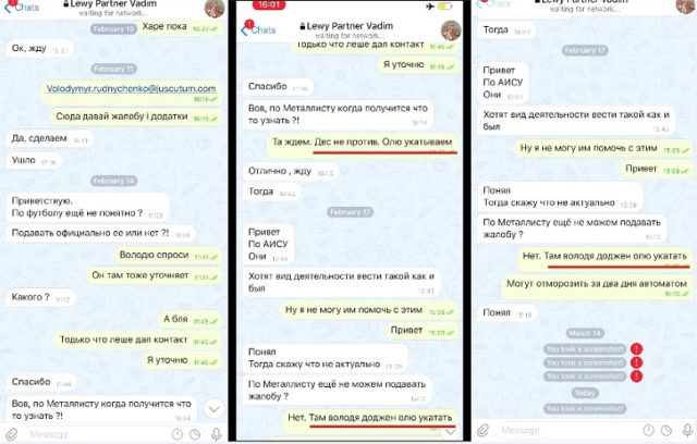 Судячи зі змісту розмови, надсилання узгодженої скарги до Рудниченка було все ще неофіційним, ознайомчим, а на подання офіційної скарги теж мав дати добро Павленко. Так, 14 лютого 2020 р «Льоші Партнер Вадім» пише Павленку: «По футболу ще не зрозуміло? Подавати офіційно її чи ні?» На що Павленко відповідає: «Володю запитай. Він там теж уточнить». Утім, абоненту не терпиться, і через деякий час він нагадує знову: «Вов, а по «Металісту» коли вийде щось дізнатися?» На що Павленко відповідає: «ДВС не проти. Олю укатуємо».