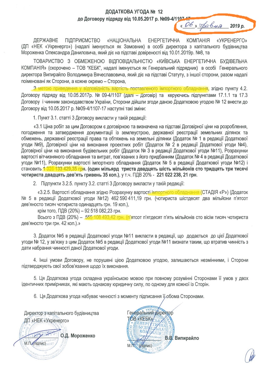 Попередня додаткова угода за 6 травня 2019 року встановлювала, що із загальної вартості договору в 1,33 млрд грн. на імпортне обладнання йшло 555,11 млн грн., або $20,96 млн.