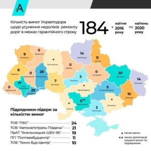 Найбільше претензій висловлювали служби автодоріг у Чернівецькій (29), Хмельницькій (28), та Харківській (20) областях. У кількох областях взагалі не було гарантійних претензій до підрядників – Київській, Полтавській, Тернопільській та Рівненській. У чотирьох службах не відповіли на запити.