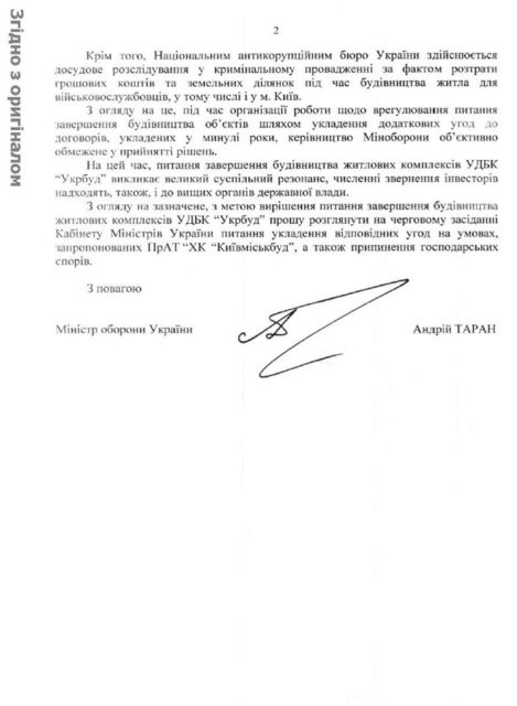 Міністр оборони України Андрій Таран звернувся до прем’єр-міністра Дениса Шмигаля з проханням «з метою вирішення питання завершення будівництва житлових комплексів УДБК «Укрбуд» розглянути на черговому засіданні Кабміну питання укладення відповідних угод на умовах, запропонованих «Київміськбудом», а також припинення господарських спорів. Про це йдеться у відповідному листі, оприлюдненому в Системі обліку публічної інформації КМДА.