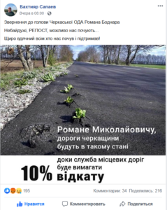 У своєму публічному зверненні до губернатора Романа Бондара Сапаєв заявив, що «служба місцевих доріг вимагає хабарі».