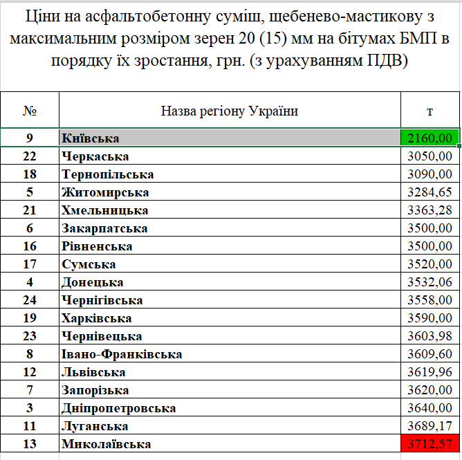 Приклад другий. «Київавтодор» у травні уклав угоду з ТОВ «Автомагістраль-Південь» на ремонт проспекту Героїв Сталінграду за 805 млн грн. Тут асфальтобетонну суміш ЩМАС-20, як видно на скріні, замовили по 3460 грн/т без ПДВ та без урахування доставки (вона вказана у сусідній колонці – 214 грн, і суттєвого впливу на остаточну ціну не має). З податком це складе 4152 гривень за тону. Це не просто дорожче від останнього прайсу ДерждорНДІ на цей вид асфальту 2 160 грн, а й банально дорожче від усіх інших регіонів.