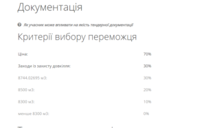 У  тендерній документації Замовник використав не тільки ціновий критерій: вказав, що 70% з критеріїв вибору переможця буде становити ціна, тоді як 30%  —    «заходи із захисту довкілля». Згідно з вимогами ТД, під час ремонту учасники могли використовувати щебенево-піщану суміш С7 або ж відходи залізистих кварцитів, які за своїми характеристиками подібні до щебеню, але є більш екологічними. За таких умов, учасники, що будуть мати той же об’єм щебенево-піщаної суміші або кварцитів, який вказаний у матеріальній відомості Агентства, отримають 30% до перемоги, а ті, що матимуть менше,  —   20% і менше. Усі чотири компанії отримали однаковий коефіцієнт з цього критерію.