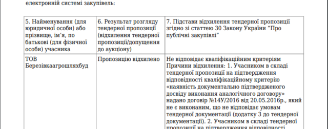 Натомість Замовник відхилив пропозицію «Березівкаагрошляхбуд» буцімто через те, що аналогічний договір, який надало підприємство, не є виконаним. Однак замовник не надав цьому жодних підтверджень.