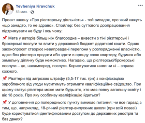 Одна – це про участь «Професійної асоціація ріелторів та сертифікованих аналітиків» у робочій групі по розробці законопроекту про брокерську (ріелторську) діяльність у сфері нерухомості весною 2019 року. За інформацією Фонду держмайна, той законопроект розроблявся на замовлення першого віце-прем’єра Степана Кубіва (того самого «порошенківця», що боровся проти знищення «майданчиків Яценка» і прес-секретаркою якого була «слуга народа» Підласа, що разом з Кубівим зараз у списку авторів «ріелторського» законопроекту). Той законопроект пропонував віддати контроль за ріелторською діяльністю частково органу рієлторського самоврядування і частково Фонду держмайна, що тоді був повністю лояльний до схем Яценка. Після зміни влади «друзів Антоші» вдалось прибрати з ФДМУ і законопроект став неактуальний. Замість нього і запустили новий проект, яким державний ФДМУ вже взагалі не включається в схему, залишаючи весь контроль над схемою громадській спілці.