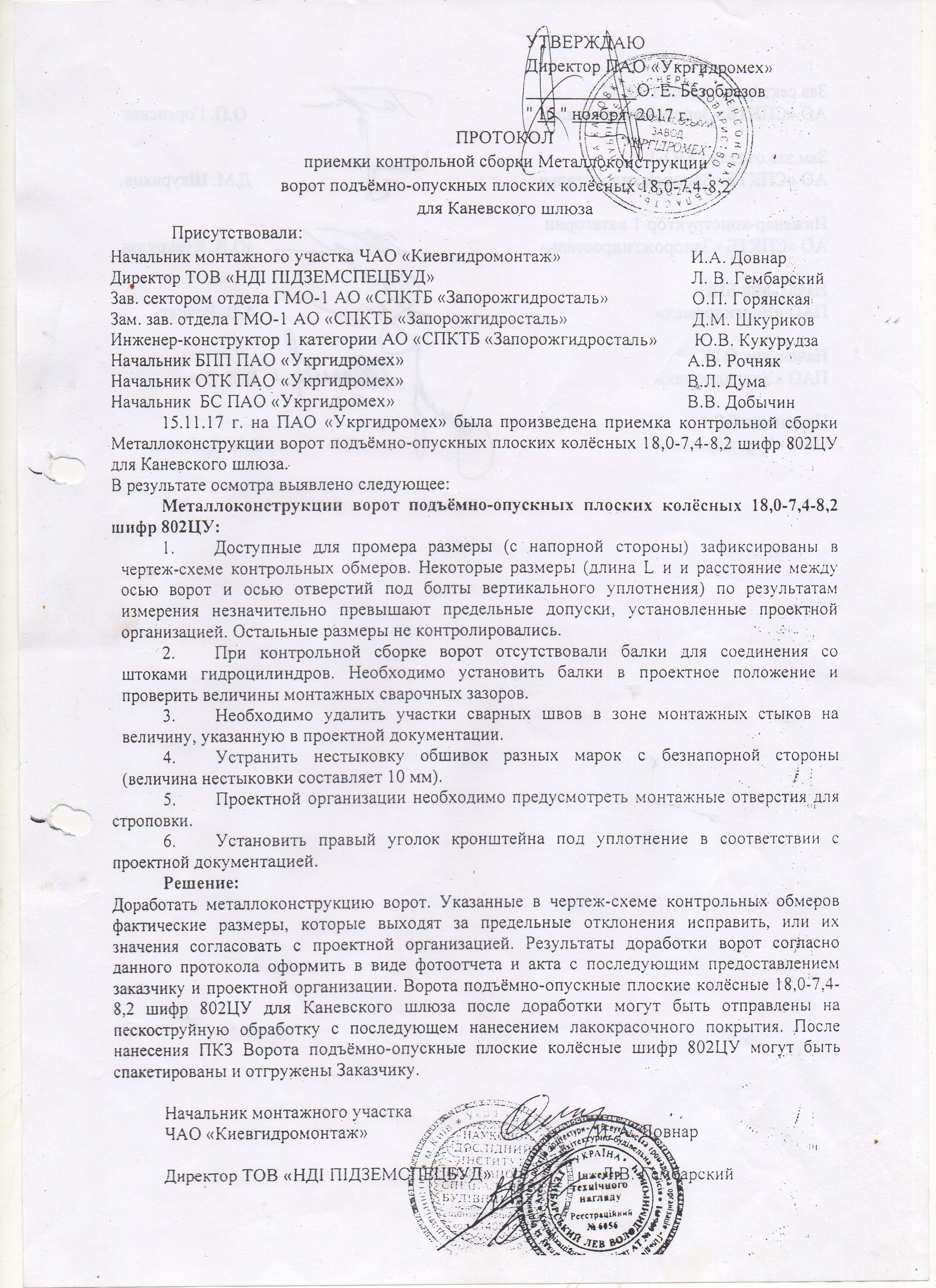 Надалі 20 листопада 2017 року завод «Укргідромех» зафіксував у відповідному протоколі, що зауваження від 15.11.2017 усунуті. Після чого ворота пройшли піскоструйну обробку, були пофарбовані і відвантажені замовнику, тобто «Київгідромонтажу».