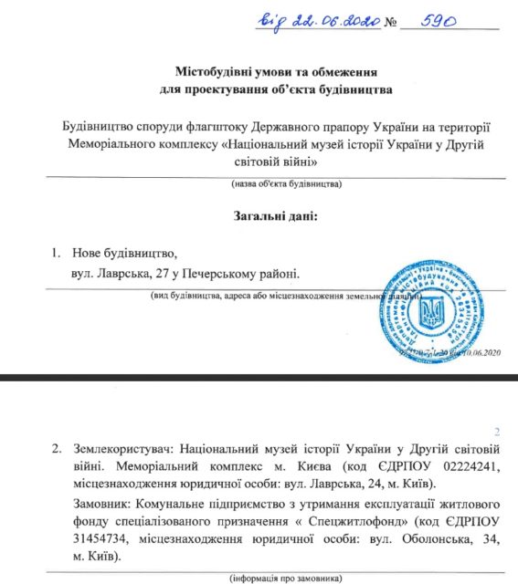 Департамент містобудування та архітектури КМДА 22 червня видав містобудівні умови та обмеження для проектування споруди флагштоку Державного прапору України на території Меморіального комплексу «Національний музей історії України у Другій світовій війні». Про це свідчать дані офіційного сайту Департаменту.