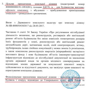 Разом з тим, у містобудівних умовах та обмеженнях зазначене цільове призначення ділянки – для будівництва житлово-офісного комплексу. Зауважимо, що це цільове призначення розроблене проектом землеустрою щодо відведення ділянки, відкритих даних про його затвердження київськими чиновниками знайти не вдалося.