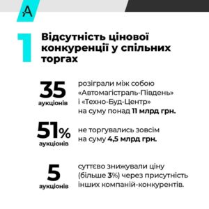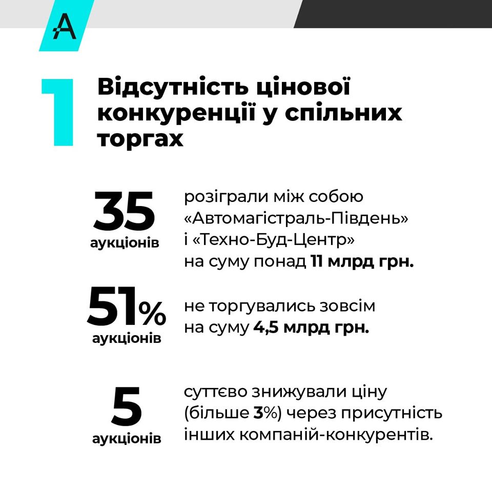 Експерти «Ліги антитрасту» виявили низку ознак змови між компаніями, що вдвох розіграли 35 тендерів на загальну суму 11 млрд.грн. При цьому «Автомагістраль-Південь» і «Техно буд центр» ні на гривню не знижували ціну у кожних других торгах.