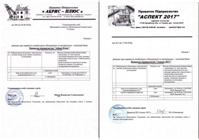 До всього, «Аспект 2017» на тендері вказувало контактним номером телефону 0684508946. Він же вказувався під час закупівель для «Абрис-плюс» і безпосередньо для ФОП Мікша Владислав Станіславович. В свою чергу, навіть в нинішньому тендері в обох учасників вказується спільний номер телефону 9-95-49 та адреса по вул. Гоголя, 54 в Токмаку.