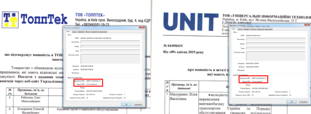 Також на одній закупівлі пропозиції «УнІТ» і «Датасістемс», за метаданими довідок про працівників, були підготовлені за допомогою ідентичного програмного забезпечення.