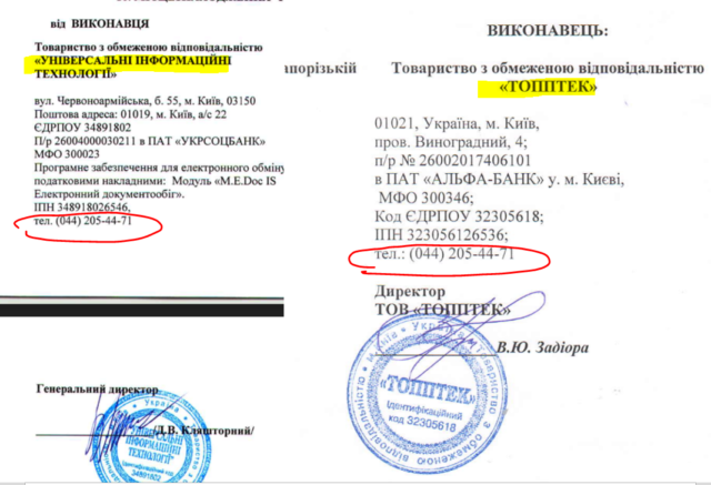 Крім того, «УнІТ» в угоді щодо поставку програмного забезпечення для АТ «Укрзалізниця», а також на власному сайті вказувало у якості контактного номер телефону 044-205-44-71. Він же був контактним для «Датасістемс», коли вона ще називалась «Топптек», в угоді на ремонт та обслуговування принтерів у Регіонального сервісного центру МВС в Запорізькій області.