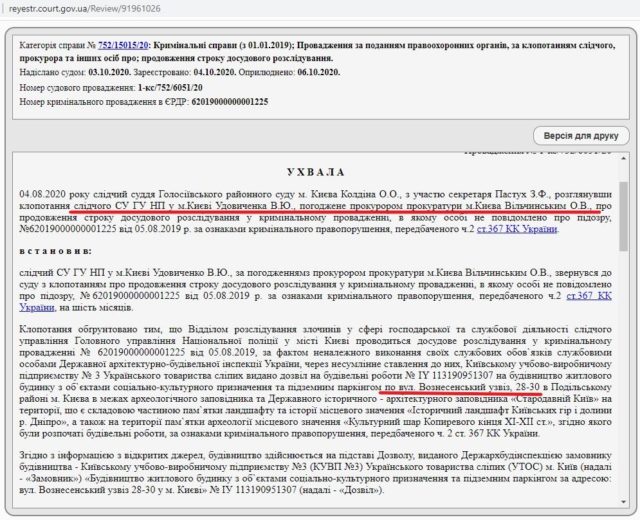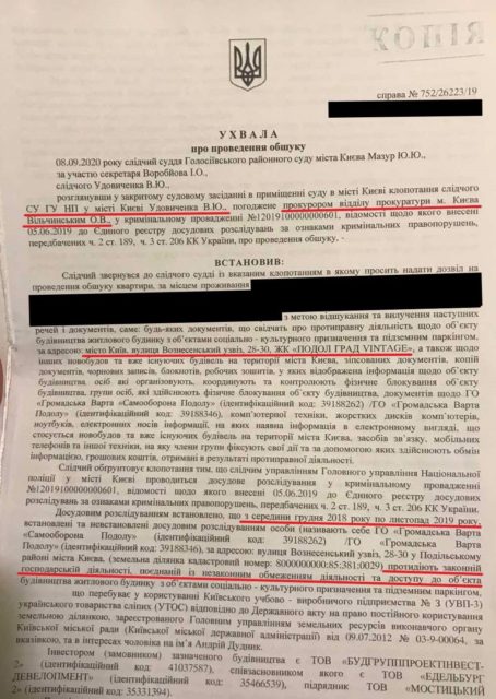 А через місяць, той самий слідчий СУ ГУ НП у м. Києві Удовиченко В.Ю. під наглядом того самого прокурора прокуратури м. Києва Вільчинського О.В. в рамках кримінального провадження № 12019100000000601 від 05.06.2019 р. за «протидію законній господарській діяльності» організовують обшуки та затримання людей, що фізично блокували завідомо незаконне будівництво на Вознесенському узвозі, 28-30, у минулому році, а наразі взагалі борються проти цього будівництва виключно в судах, соціальних мережах та ЗМІ.