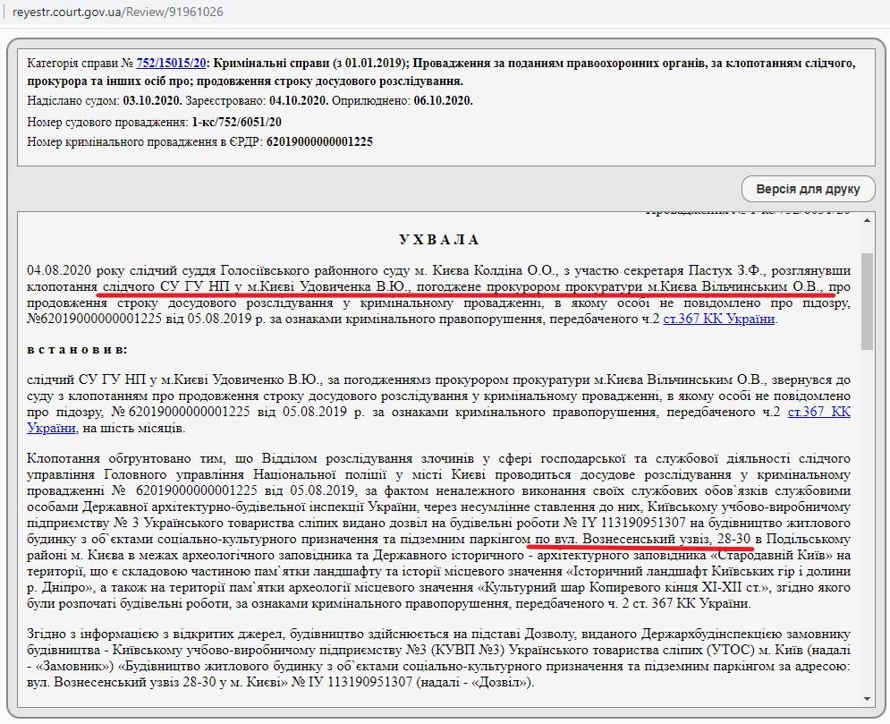 Відповідно до ухвали Голосіївського суду від 04.08.2020 по справі № 752/15015/20, слідчий СУ ГУ НП у м. Києві Удовиченко В.Ю. під наглядом прокурора прокуратури м. Києва Вільчинського О.В. ведуть досудове розслідування у кримінальному провадженні № 62019000000001225 від 05.08.2019 р. за фактом неналежного виконання своїх службових обов`язків посадовими особами ДАБІ при наданні дозволу на будівництво саме ЖК «Поділ Град Vintage» на Вознесенському узвозі, 28-30.