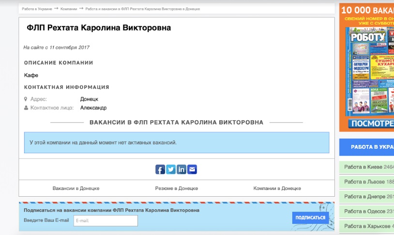 Так, зараз тривають суди щодо реєстрації ФОП та двох фірм на переселенку Кароліну Рехтату. Як розповідає адвокат потерпілої Світлана Копсова, у 2014 році Рехтата переїхала з Луганська до Одеси, стала працювати перукарем, і пішла в податкову реєструвати ФОП. Але їй відмовили, бо Рехтата вже була зареєстрована підприємницею, а ще – власницею двох столичних компаній ТОВ «Комфортстрой-Н» і ТОВ «Загаронь». ФОПом Рехтату зробила все та ж Наталія Доманська із «Благоустрою Крюківщини», того ж дня, що й Сільченка, 20 квітня 2017 року, з тим же видом економічної діяльності, з тою ж адресою у Біївцях без конкретної адреси та телефона. А ось засновницею фірм Рехтату вже реєстрували в іншому місці – у миколаївського нотаріуса Тетяни Боненко. Жодного стосунку, каже Рехтата, до дільності ФОПа та компаній вона не має, у Доманської та Боненко не була, паспорта не втрачала і нікому не передавала, довіреностей ні на кого не виписувала. Повернувшись додому з податкової, жінка почала шукати інформацію про ФОП, оформлений на неї, в інтернеті. І знайшла оголошення на сайті пошуку працівників Jobs.ua, текст якого уже недоступний, але в ньому зазначено в графі «описание компании» – «кафе», «адрес» – «Донецьк».