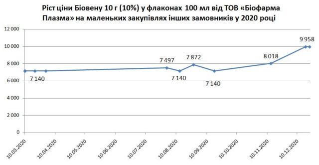 На стільки ж виросли й ціни Біовену 10 г (10%) у флаконах на 100 мл від «Біофарма Плазма» на маленьких закупівлях інших замовників. У березні вона продавала його по 7 140 грн., улітку почалось подорожчання, і зрештою в грудні ціна сягнула 9 958 грн.