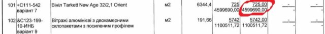 За підсумковою відомістю ресурсів без доставки і ПДВ, вибірково перевірені ціни загалом відповідають ринку. Однак 6 344 кв. м вінілового лінолеуму Tarkett New Age Orient класу 32 товщиною 2,1 мм на суму 4,60 млн грн. купили по 725 грн./кв. м. В інтернет-магазинах таку вінілову плитку продають від чверті до півтора раза дешевше – по 433592 грн./кв. м, причому в роздріб, тоді як гуртові ціни ще нижчі. До того ж, вона вироблена в Росії.