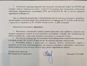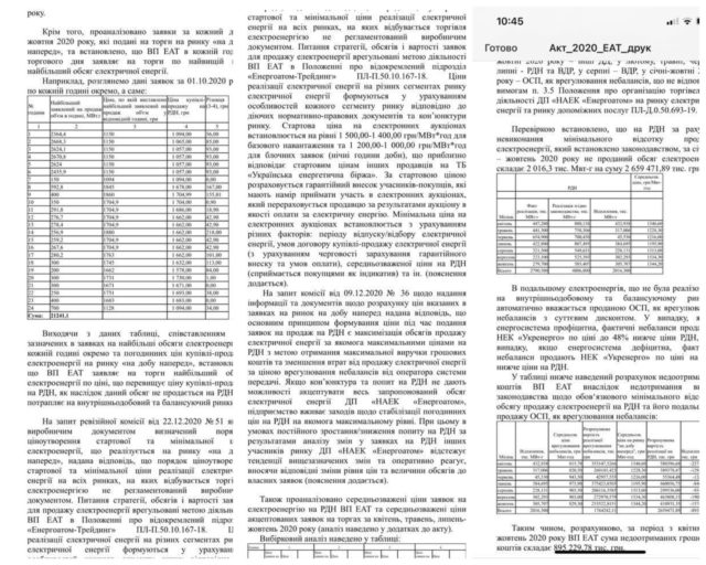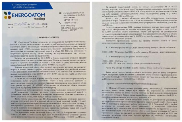 Згідно акту, «Енергоатом-Трейдинг» заявляє на торги найбільший обсяг електроенергії по ціні, що перевищує ціну купівлі-продажу на ринку «на добу наперед». Як наслідок, даний обсяг не продається на ринку «на добу наперед» і потрапляє на внутрішньодобовий та балансуючий ринки. Потім електроенергія, не реалізована на внутрішньодобовому та балансуючому ринках, автоматично вважається проданою операторам системи передачі як врегулювання небалансів із суттєвим дисконтом. Таким чином, розрахунково в квітні-жовтні 2020 року «Енергоатом-Трейдинг» недоотримав кошти в сумі 895,23 млн грн.