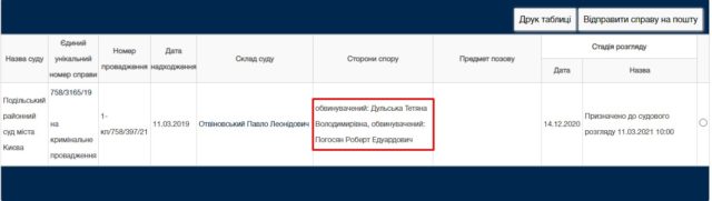 11 березня 2021 року в Подільському райсуді Києва слухатимуть справу по ТОВ «Держзакупівлі.Онлайн» за обвинуваченням київського нотаріуса Тетяни Дульської та поліцейського Роберта Погосяна. Про це «Нашим грошам» стало відомо з сайту «Судова влада».