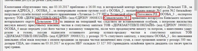Нотаріус та поліцейський проходять обвинуваченими у кримінальному провадженні 42018100000001091, яке виділили з іншого провадження – 42017100000001470 від 18 листопада 2017 р. Як раніше повідомляли «Наші гроші», Нацпол викрив групу осіб, які, за версією слідства, незаконно заволоділи 50% частки ТОВ «Держзакупівлі.Онлайн» – приватної компанії, яка надає послуги з доступу до системи публічних закупівель Prozorro, водночас, не входить до Prozorro і не є одним із його сайтів.