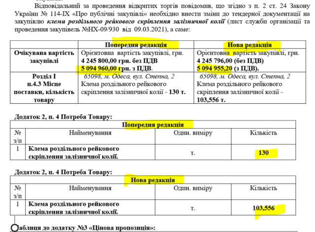 «Одеська залізниця» відповіла, що розгляне можливість підвищення ціни і зрештою виконала прохання наступним чином: 16 березня тендерний комітет зменшив обсяги закупівлі з 130 до 103,556 тон, залишивши очікувану вартість тендеру в системі незмінною.