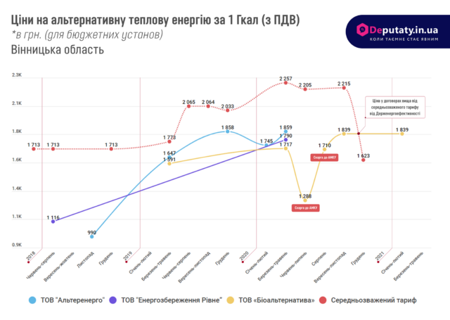 Починаючи з грудня 2019 року КЕВ м. Вінниця починає закуповувати (1,2) тепло, вироблене на альтернативних джерелах в основному за переговорною процедурою і ціна починає різко зростати і становити 1858 грн/Гкал. «Біоальтернатива» стала приймати участь в закупівлях рік тому. Конкурентна фірма – ТОВ «Альтеренерго», в скарзі до АМКУ звинувачувало компанію у заниженні цін пропозиції та вказувало, що після перемоги на тендерах «Біоальтернативи» замовник більше не проводив торгів по опаленню цих об’єктів. Проте рішенням колегії АМКУ скаржнику було відмовлено.