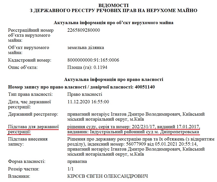 Більше того, у травні 2020 року до поліції звернувся громадянин, який заявив, що вказаний чоловік використав його документи з метою заволодіння нерухомим майном у Києві, представляючись його представником у суді. На підставі цієї заяви проводиться розслідування. За даними слідства, вказане рішення Індустріального райсуду м. Дніпропетровська 2017-го року було внесено до Єдиного держреєстру судових рішень 16.03.2020, а 20.03.2020 в Держреєстр речових прав на нерухоме майно нотаріус внесла запис про право власності на будівлю ТОВ «Нерухомість класа Люкс», директором і власником якого є Євген Кірєєв. На нього ж у грудні 2020-го на підставі рішення Індустріального райсуду зареєстрували право власності на ділянку 0,12 га (вже з новим кадастровим номером – 8000000000:91:165:0006; раніше ділянка мала номер 8000000000:91:165:0032).