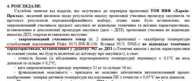 «Вимоги щодо більшості метрологічних характеристик викладені таким чином, що їм відповідає прилад лише від одного виробника з вищенаведених. По більшості метрологічних характеристик наше обладнання навіть значно краще, наприклад, якщо взяти діапазон температури оточуючого повітря при експлуатації від 0 до +50С, що є більш поширеним для клімату України, ніж від +15 до 35С, викладеного в умовах закупівлі», – вказано у вимозі.