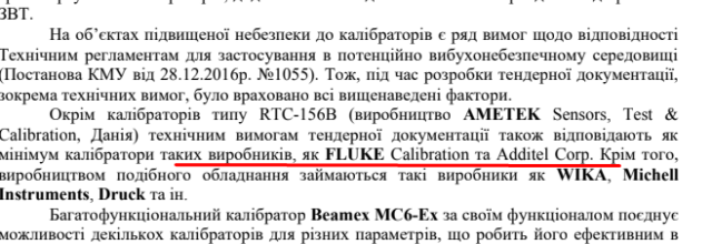 «Багатофункціональний калібратор Beamex MC6-Ex за своїм функціоналом поєднує можливості декількох калібраторів для різних параметрів, що робить його ефективним в експлуатації. Аналогом, за належної комплектації та калібруванню, може бути багатофункціональний калібратор Druck DPI 620. Щодо інших виробників, то, для забезпечення аналогічних характеристик та функціоналу потрібно використовувати не один, а декілька різних (окремих) калібраторів, що може призвести до додаткових витрат», – вказано у відповіді.