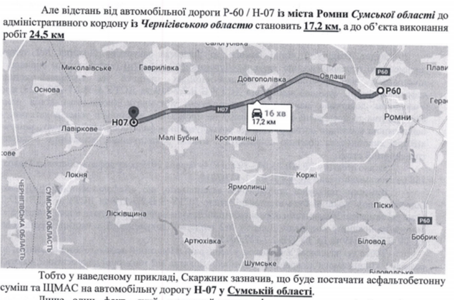 Під час розгляду скарги Чернігівська САД пояснила, що згідно транспортної схеми учасник планував поставляти будматеріали на Н-07 у сусідню Сумську область. Перевезення мало відбуватись по дорозі «Р-60 Кровелець – Конотоп – Ромни – Пирятин» зі з’їздом на «Н-07 Київ – Суми – Юнаківка (на м. Курськ)», на якій будуть виконуватися роботи. З’їзд із Р-60 на Н-07 відбувається у місті Ромни Сумської області ( це єдине місце пересічення доріг). Від виїзду на Н-07 учасник вказав подальшу відстань транспортування всього у 2 км. Натомість із Ромен, як зазначає замовник, відстань по Н-07 до кордону із Чернігівською областю становить 17,2 км, а до об’єкта виконання робіт – 24,5 км.
