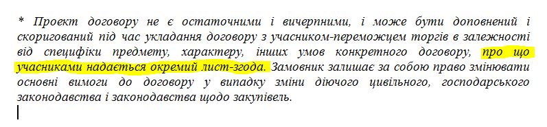 Як відмітила експерт «Ліги антитрасту» Галина Верцімаха, вимагати від учасників такий лист-згоду незаконно. За її словами, така вимога замовника порушує частину 4 статті 41 Закону «Про публічні закупівлі», що забороняє вносити будь-які зміни, які суперечитимуть вимогам тендерної документації та пропозиції, в проєкт договору про закупівлю перед підписанням. Як наслідок, за пунктом 2 частини 1 статті 43 Закону цей договір автоматично вважатиметься нікчемним та навіть не потребуватиме визнання недійсним у судовому порядку.