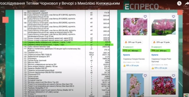 Саджанці верби та клени закладені в кошторисі по 428 грн. за штуку. В агромагазинах ціна клена не перевищує 40 грн. А за ціну в 400 грн. продавці пропонують купити квітучу сакуру.