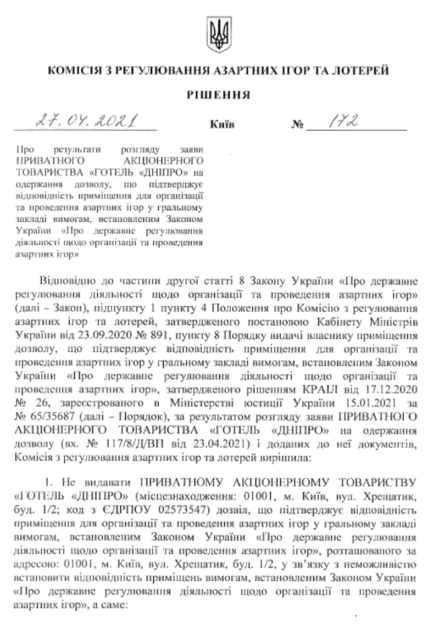 Комісія з регулювання азартних ігор та лотерей відмовила ПАТ «Готель «Дніпро» у видачі дозволу на проведення азартних ігор.