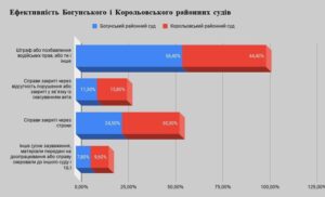 За ефективністю кращим виявився Богунський районний суд – 56% справ завершилися реальним покаранням, а кількість справ закритих через строки склали 24%. Натомість Корольовський районний суд покарав 44% правопорушників, а відсоток закритих справ через строки склав 30%.