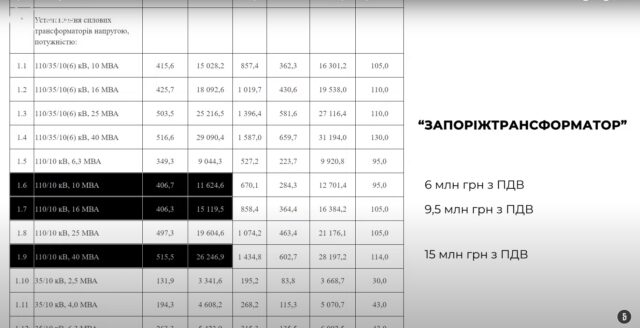 Так, установлення силових трансформаторів напругою/потужністю 110 кВ/10 МВА в методичці було оцінено в 11,62 млн грн.. Запорізький завод їх продавав їх майже вдвічі дешевше – по 6 млн грн. Трансформатори 40 МВА записані по ціні 26,25 млн грн../шт., а «Запоріжтрансформатор» вказав їх ціну в 15 млн грн. – на 57% дешевше.