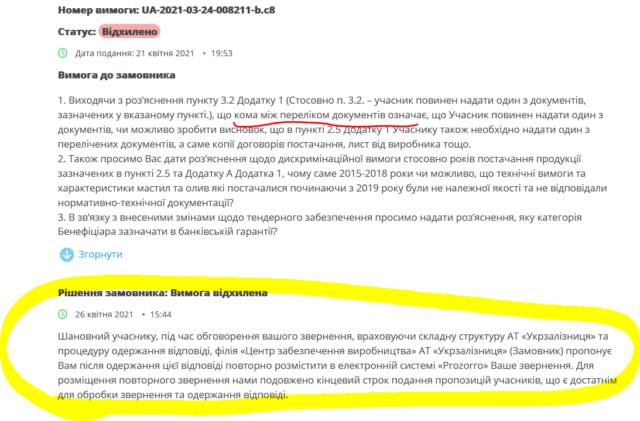 РS. І до речі щоб двічі не вставати. Відмітимо ще абсолютно хамську та протизаконну манеру залізничників відповідати на вимоги учасників. Ось наприклад, фірма просила роз’яснити абсолютні прикладні речі – як правильно подати тендерні документи, щоб її не відхилили за неоднозначну інтерпретацію коми. Але залізничники просто сказали – залізниця велика, ми не можемо погодити як вам правильно відповісти, тому спитайте у нас ще раз, а зараз відповіді не буде! І таке хамство – постійно.