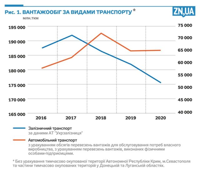 Однак загальний обсяг вантажообігу в країні майже не змінився. Тобто перевезення автотранспортом збільшуються виключно за рахунок витіснення залізничних. За п’ять років вантажівки «з’їли» 6% ринку у залізниці.