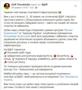 Нагадаємо, раніше заступник керівника Офісу Президента України Кирило Тимошенко повідомив, що 28 травня на ВДНГ стартують підготовчі роботи з облаштування урбан-парку. В тому числі бетонного скейт-парку, майданчиків для вуличного футболу, баскетболу, воркауту, паркуру, танців, клаймбінгу (скелелазіння), дитячих урбан-локацій і столів для тенісу.