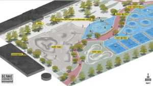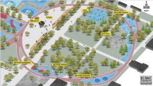 Зокрема влаштують бігову доріжку, покриття тротуарів, скейт-парк, івент-зону з гумовим покриттям, два корти для вуличного футболу «панна» зі штучною травою, два корти для вуличного футболу «3х3» зі штучною травою та з гумовим покриттям, майданчик для баскетболу з двома кільцями та гумовим покриттям, модульний туалет, інформаційні стенди, водопостачання, водовідведення, лави, урни, велопарковку, озеленення тощо.