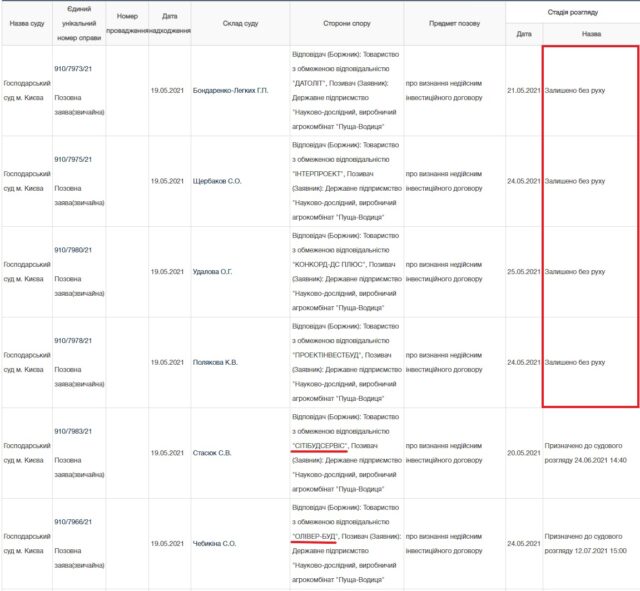 У березні 2017 року, ТОВ «Інвест-Будсістемс», що входить до бренду Stolitsa Group, подає у Господарський суд Києва позов до двох інших компаній із тієї ж групи: ТОВ «Олівер-Буд» і ТОВ «Сітібудсервіс» та ДП «НДВА «Пуща-Водиця» з вимогою визнати недійсними інвестиційні договори про забудову земель ДП.