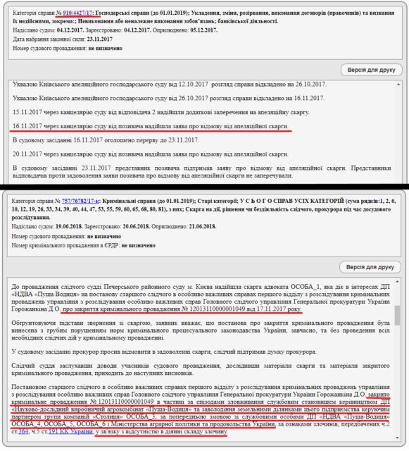 Щоб не ризикувати, ТОВ «Інвест-Будсістемс» 16.11.2017 відмовляється від апеляційної скарги. А вже на наступний день, 17.11.2017, навіть не дочекавшись рішення КАГС про припинення справи, старший слідчий ГСУ ГПУ Дмитро Горожанкін закриває кримінальне провадження по ділянкам ДП «НДВА «Пуща-Водиця» в Києві у зв’язку з відсутністю в діянні складу злочину. (Рис. 4)