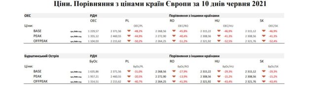 Середні ціни на ринку «на добу наперед» торгової зони «ОЕС України» та торгової зони «Острів Бурштинської ТЕС» поки що залишаються суттєво нижчими за відповідні показники сусідніх країн: індекси цін базового навантаження ОЕС менше на 46%-48%, індекси цін базового навантаження БуОс менше на 28%-31%.