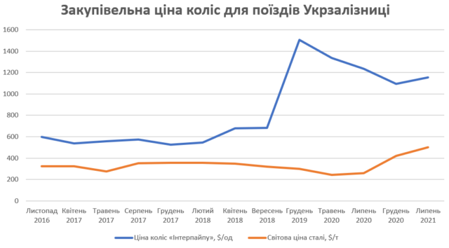 У попередній раз залізниця закуповувала такі колеса в грудні 2020 року. Тоді ціна «Інтерпайпу» складала 31 200 гривень/колесо (1095 дол. США). Тобто вартість колеса у доларовому виразі зросла на 4%, а у гривні зменшилась на 0,7%. За цей час біржова ціна сталі зросла майже на 20%, з 421 до 517 доларів за тону.