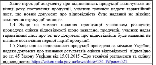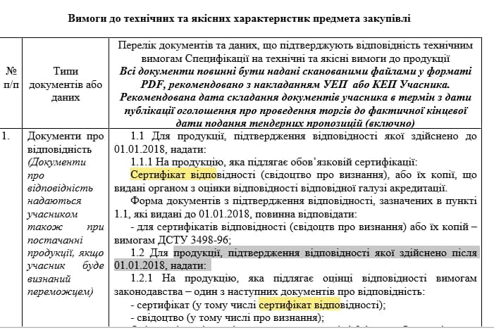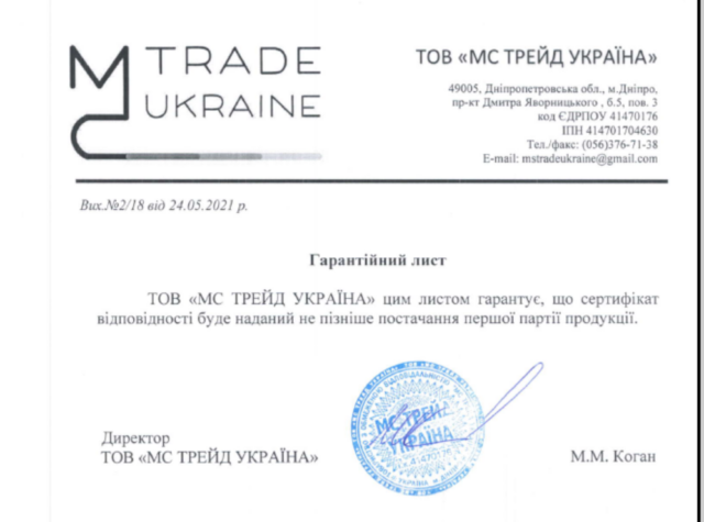 Продукція цього підприємства поки не пройшла сертифікацію відповідності в Україні. Тому «МС Трейд Україна» замість сертифіката в своїй пропозиції надав довідку з обіцянкою такий сертифікат надати.